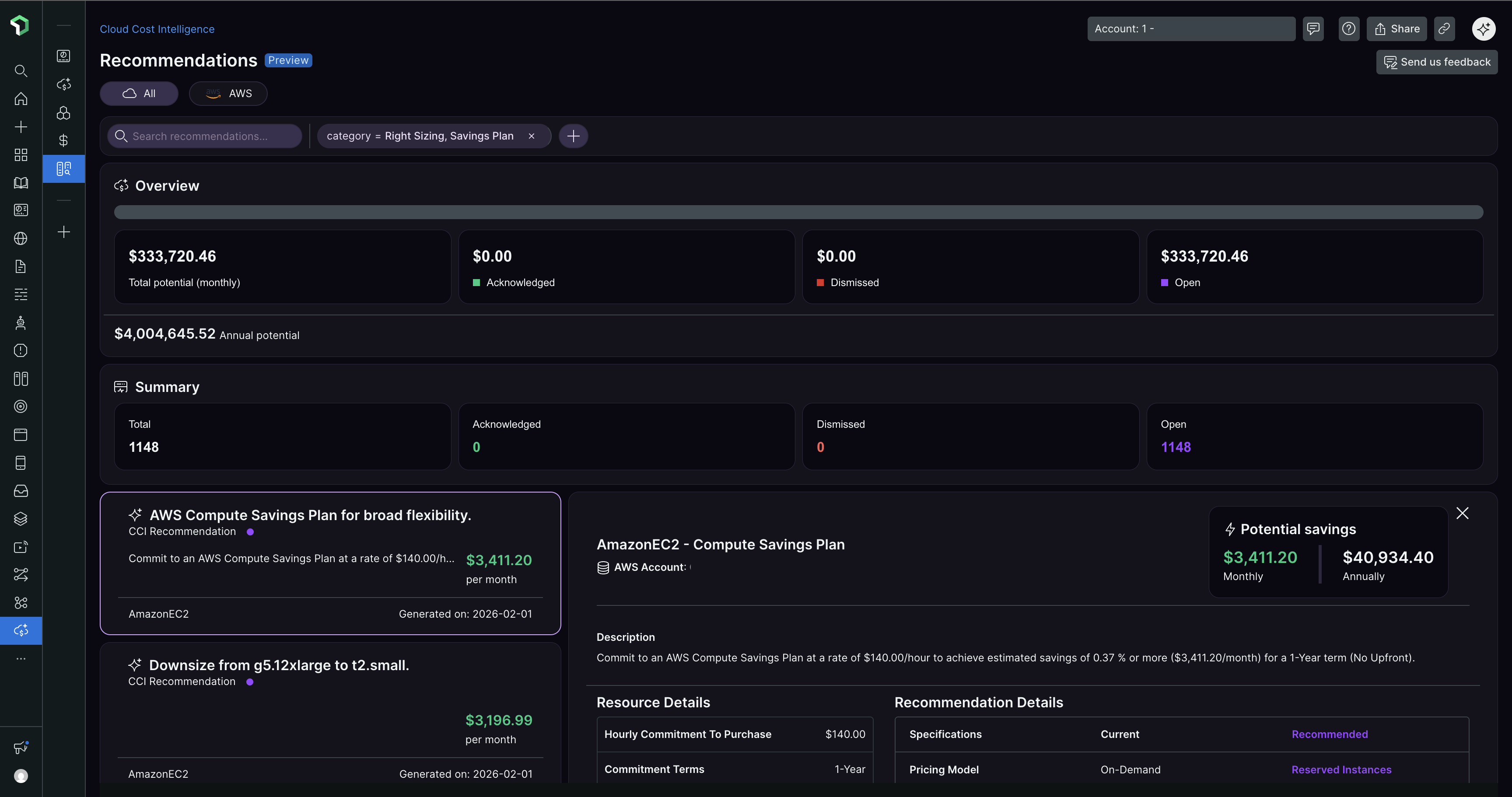 CCI's native optimization engine analyzes resource utilization and usage history to identify opportunities for right-sizing instances and reducing costs through AWS Savings Plans commitments.