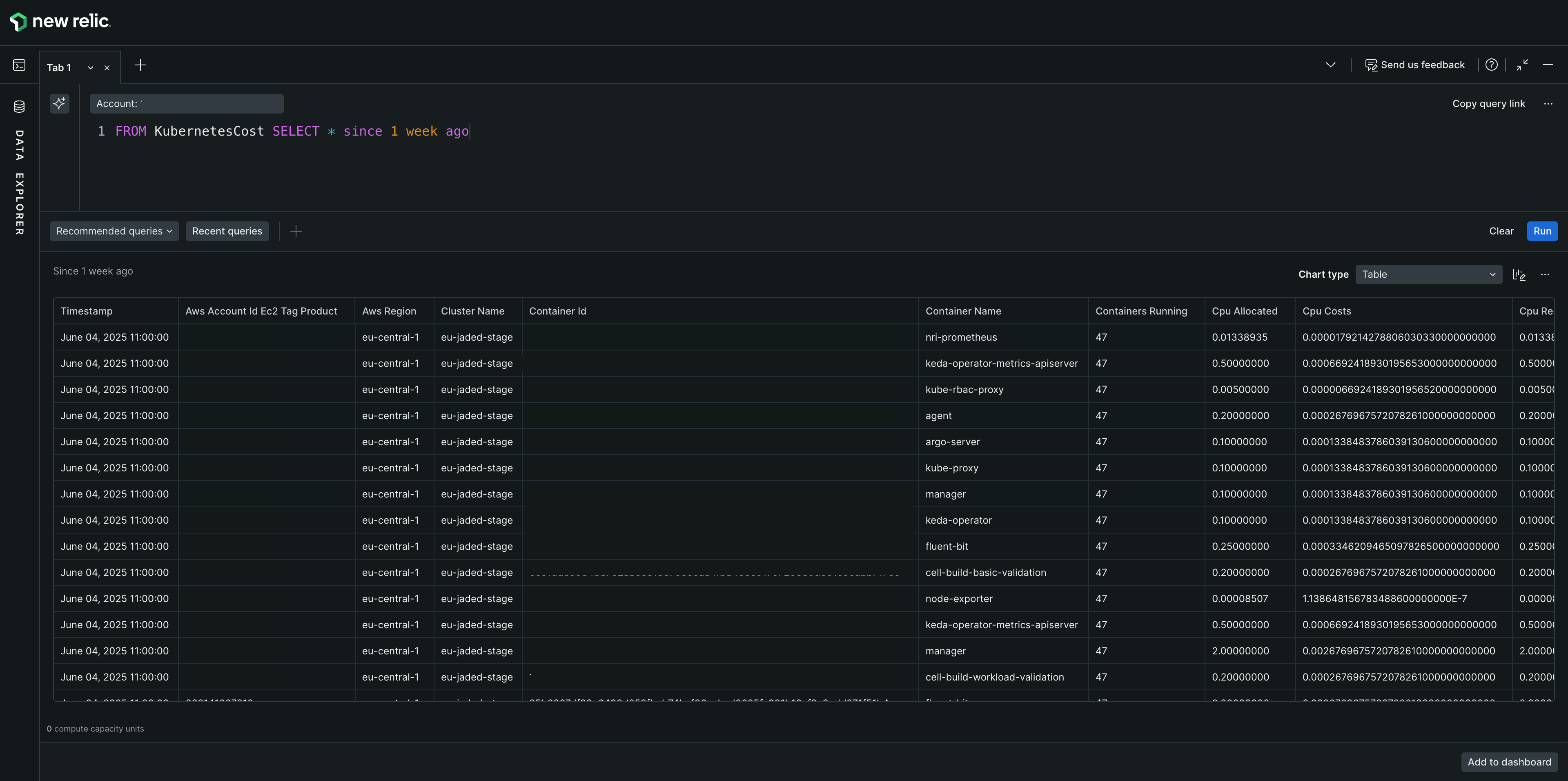 FROM KubernetesCost SELECT * SINCE 1 week agoFor accurate Kubernetes costs, multiply cpu_weightage + memory_weightage in your queries:
