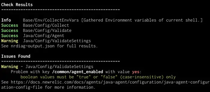 $./nrdiag -t Java/Config/ValidateSettings -c newrelic.ymlHere is an example of the output for an incorrect setting. The agent_enabled setting in this case has a value of yes, but the Java agent only accepts the values true or false. This misconfiguration will prevent the agent from running.