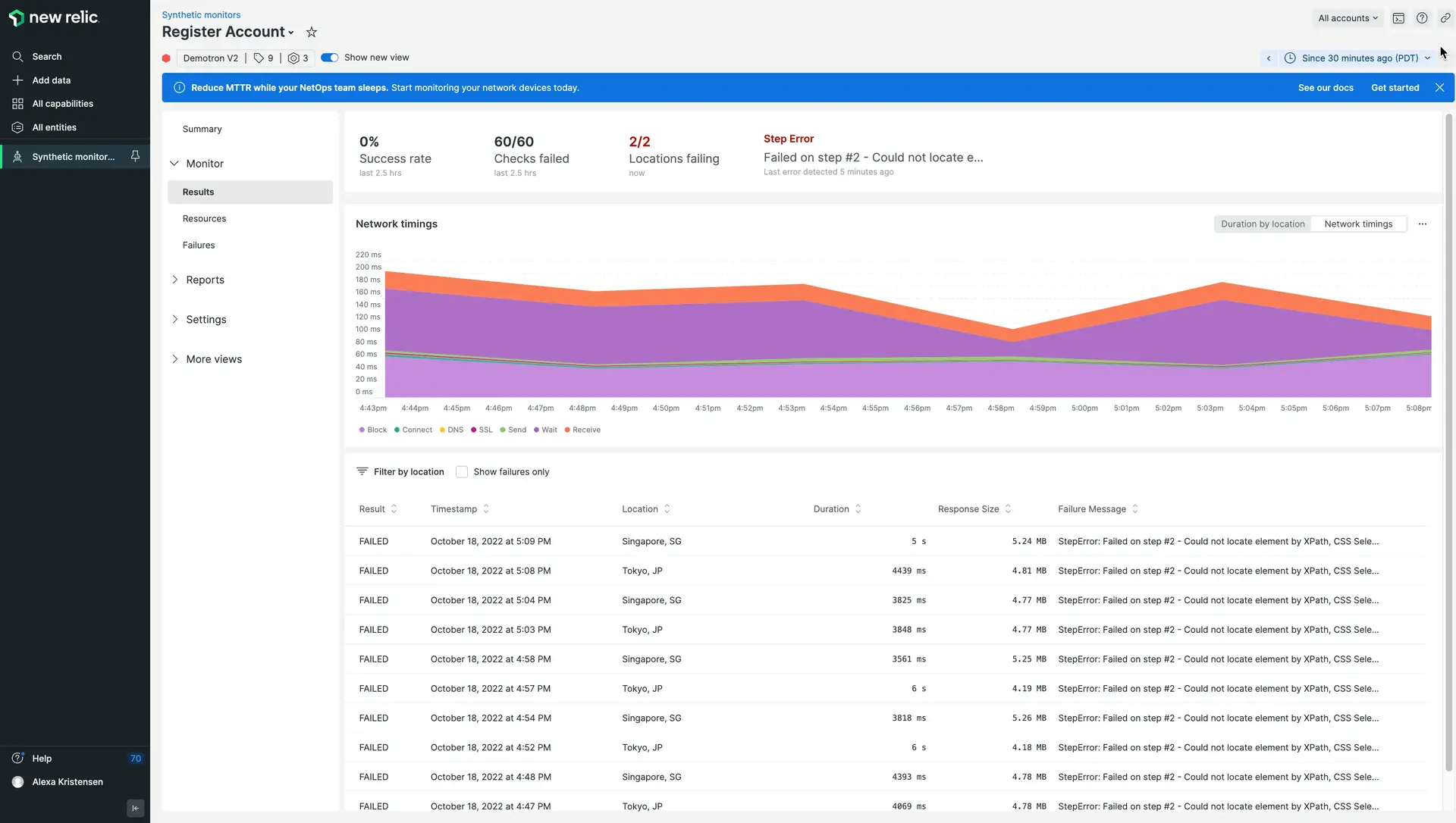 To access your monitor's Results: Go to one.newrelic.com > Synthetic monitoring > (select a monitor) > Results.