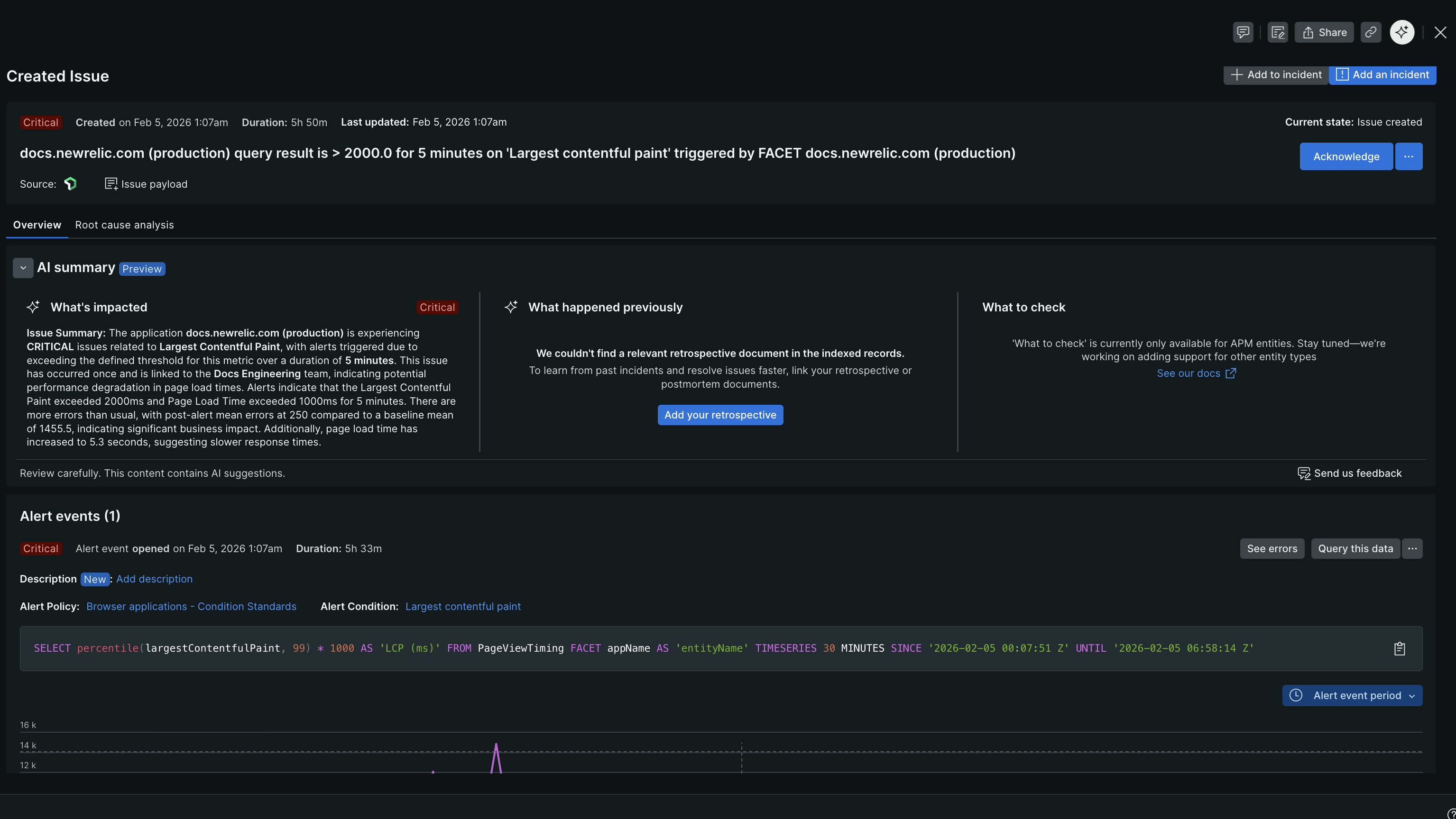 The Issue page, now integrated with New Relic AI, offers real-time insights to help reduce the mean time to resolution (MTTR) of issues and alert events. It brings together the key details of an alert event into a single view, enabling you to quickly understand the context of an issue without navigating through multiple screens.