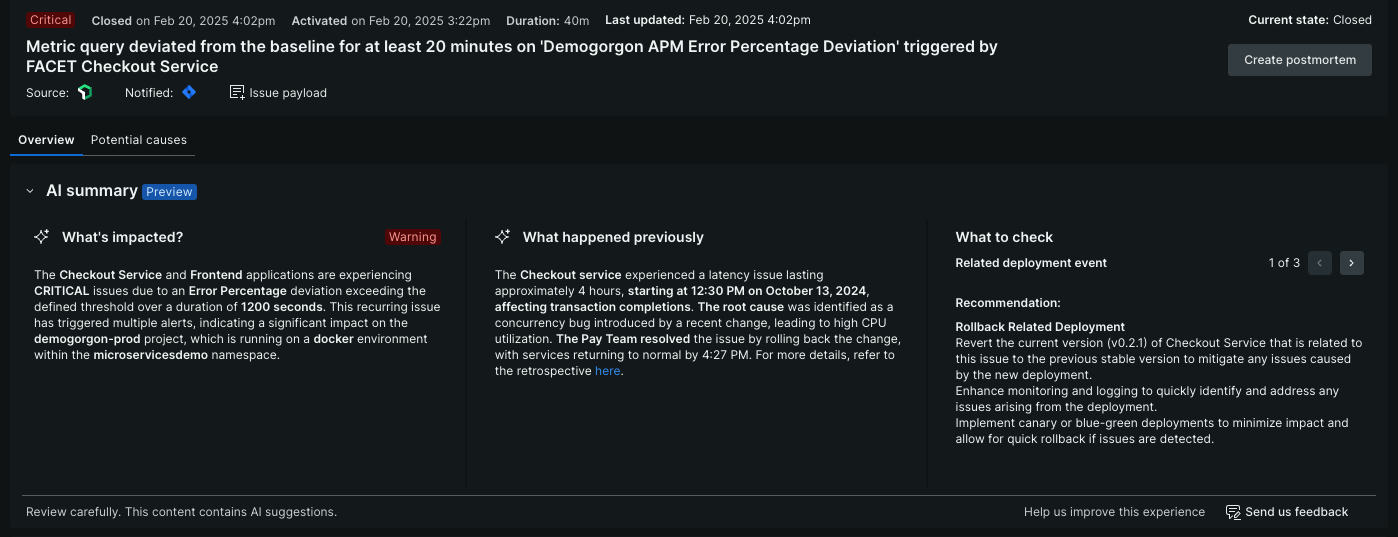 The AI-powered issue page provides a concise summary that includes the affected entity, the severity of the issue, an explanation of the alert condition, and additional details to assist with debugging. Additionally, the issue page includes a new ‘overview’ tab with three widgets that address the most critical questions first responders ask when dealing with an issue.